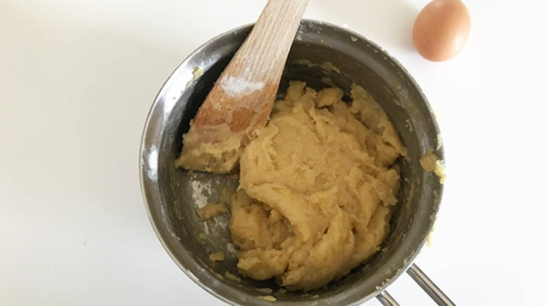 Stap 4: Haal nu het pannetje van het vuur af en voeg één van de 2 eieren toe. Roer het ei goed door elkaar totdat het deeg het goed heeft opgenomen. Nu voeg je het tweede ei toe en meng je dat ook goed door elkaar.